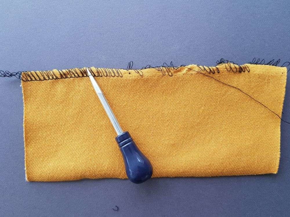 Beim «OverStricken» näht man mit der Overlock auf einen Streifen (Organza, Jersey, Bündchen, was auch immer) und näht immer wieder einen Streifen davon an, indem die Overlock den vorigen Streifen gerade noch mitfasst. So entstehen schöne Abschlüsse, Kanten oder sogar Accessoires wie Taschen oder Bündchen.