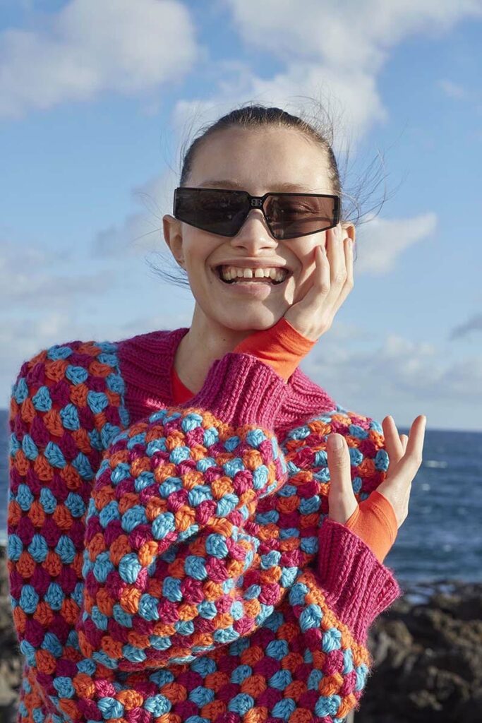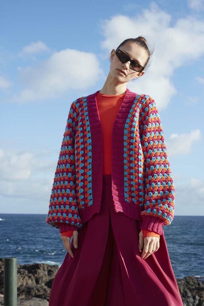 If you listen carefully, you hear the poems of the deep blue sea This awesome cardigan is both crocheted and knitted. The sleeves are slightly oversized but that gives the whole thing a funky look. This cardigan will slip off your crochet hook as well as your knitting needles in no time. Which color combination will you choose?