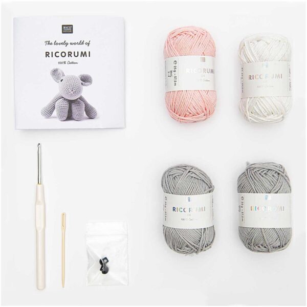 Dieses Ricorumi Set beinhaltet alles, was Sie zum Häkeln der süßen Amigurumi-Figur benötigen: Creative Ricorumi dk Garn, Knopfaugen, Häkel- und Nähnadel sowie eine ausführliche Anleitung.