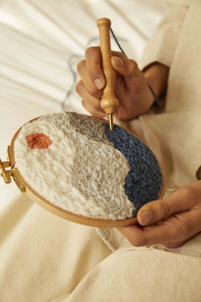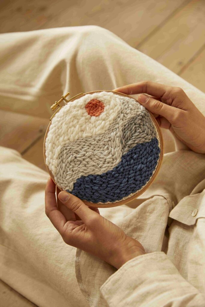 Lassen Sie Ihren Gedanken freien Lauf, während Sie diese Berglandschaft mit der Stanznadeltechnik (punch needle) nachbilden. Das moderne Motiv ist eine hübsche Dekoration für Ihr Zuhause.