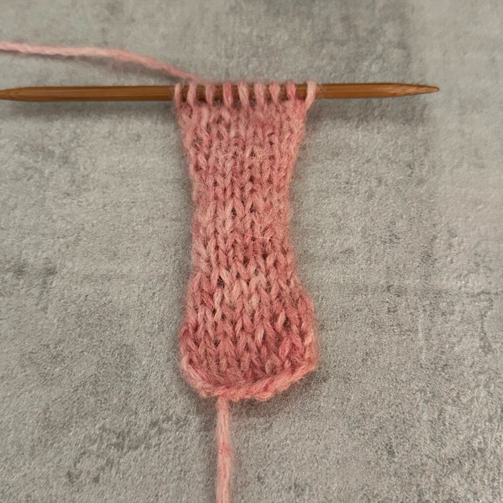 Nimm die 11 stillgelegten M wieder auf die Nadel und setze den Faden neu an um zuerst eine RückR zu str wie folgt:
