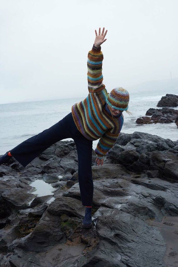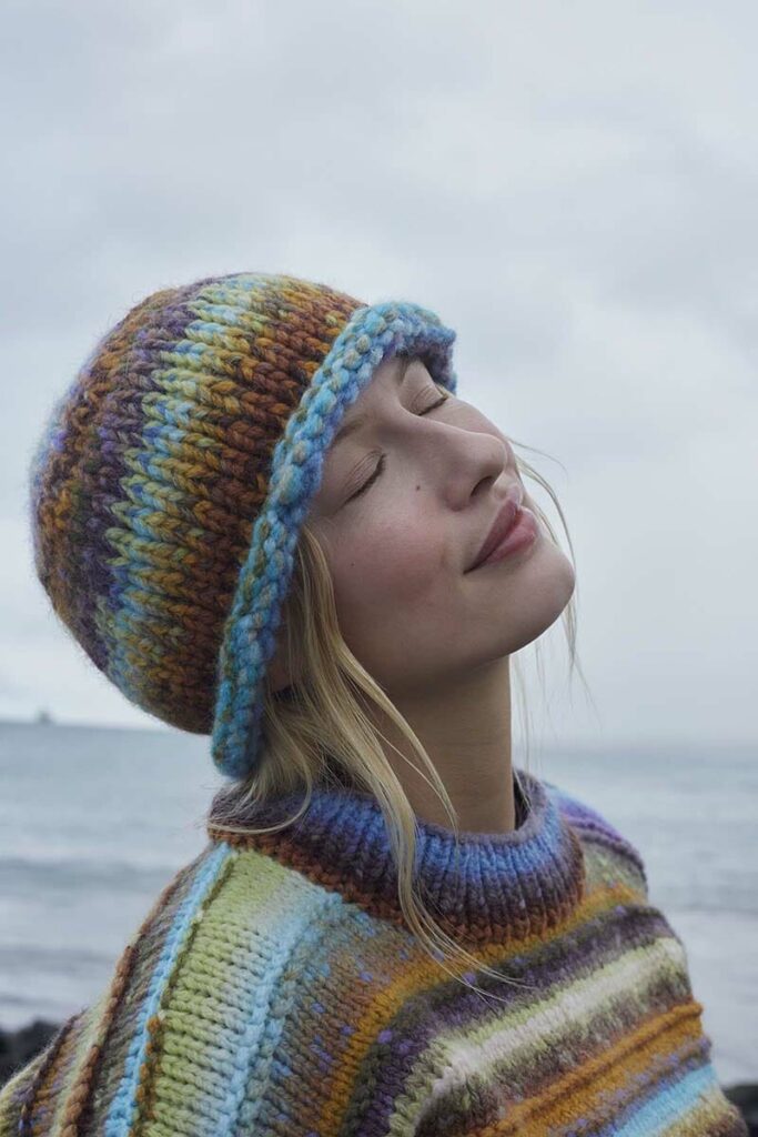 Astrid rocks her cool bucket hat pictured here. The color combination is to die for and combined with her cool «FIND JOY» sweater, it’s a match made in heaven.