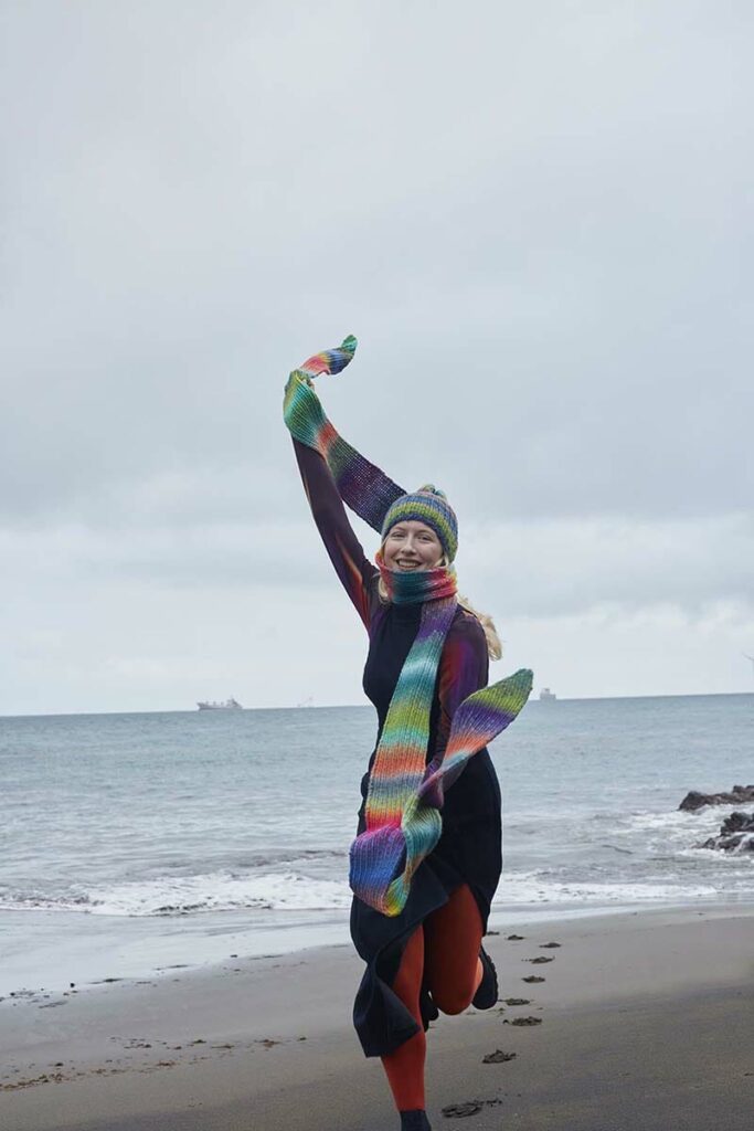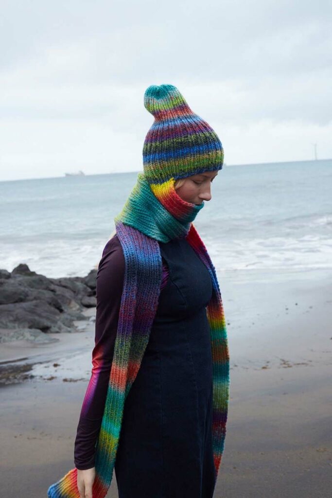 Have you ever seen such a cool accessory? It looks like a balaclava, but it certainly isn’t. It is a knitted hat with a lovely shawl attached to it, which of course you can wrap around as much as you like. A wonderfully wearable magic ball.