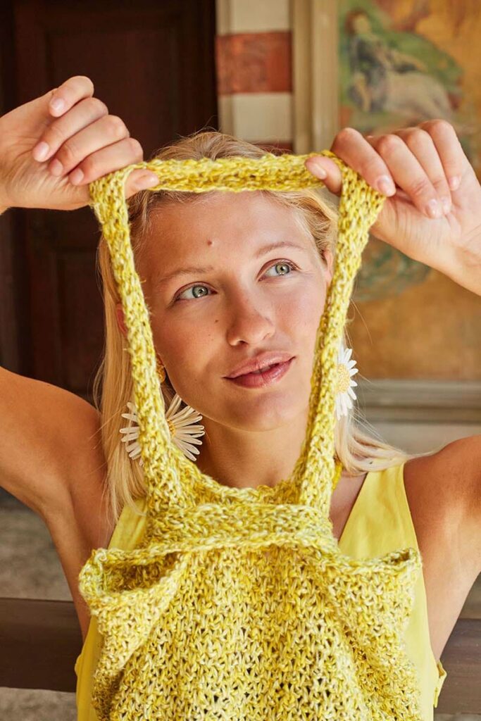 Von nun an können Sie alle Ihre Souvenirs in einer Tasche sammeln, oder wenn Sie in Bergamot sind, können Sie die köstlichsten Zitronen kaufen, um vielleicht Ihren eigenen Limoncello zu machen. Diese Tasche ist super leicht und die Leinenoptik wirkt sehr verspielt. Kombiniere diese Tasche mit einer schönen grossen Sonnenbrille oder einem Paar Ohrringe wie Astrid sie trägt und du bist bereit für einen schönen sonnigen Tag.