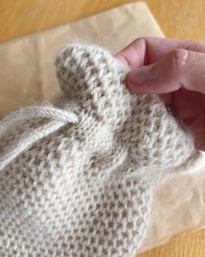 Die Honey Bucket Bag wird in einem Stück von unten nach oben gearbeitet. Zuerst erfolgt der glatt rechts gestrickte Boden, woraufhin die Seiten im Netzpatent gestrickt werden. An der oberen Kante wird ein Tunnelzug für die Schnürung gefertigt. Zuletzt wird das Taschenfutter genäht, das in der Tasche eingenäht wird Die Anleitung beinhaltet Nähanweisungen für das Futter.