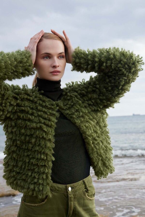 A double-breasted jacket knit in squishy garter stitch, FLAMING HUE envelopes you with warmth and style. The rhythmic undulation of the garter stitch, reminiscent of dancing flames, not only speaks to but also ignites the inner fire of your creativity, transforming each stitch into a vibrant expression as you breathe life into the embers of this project.
