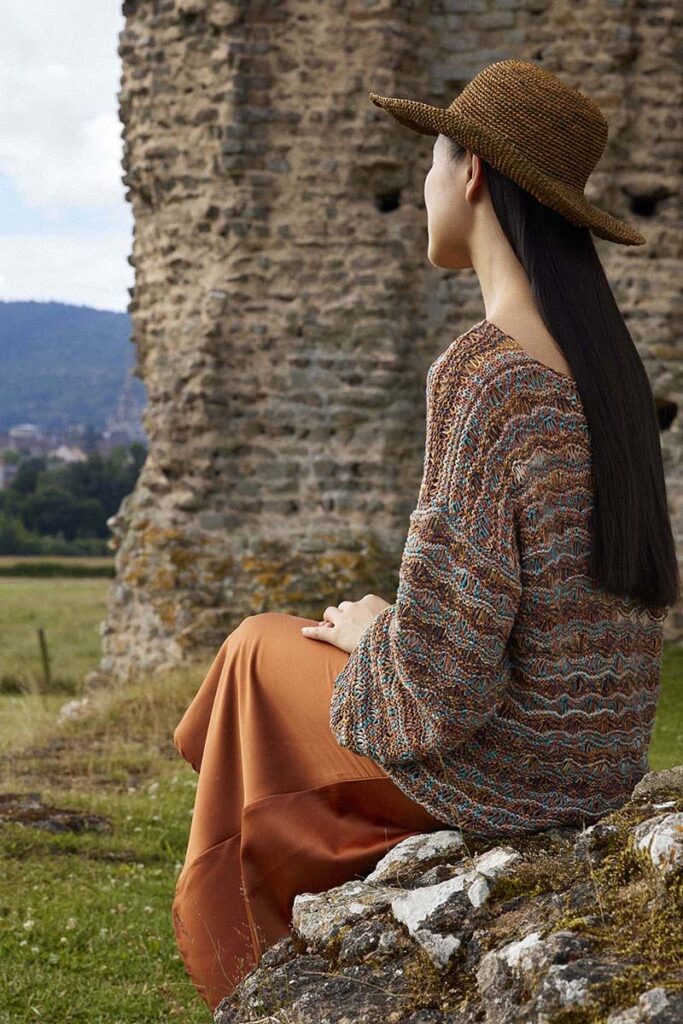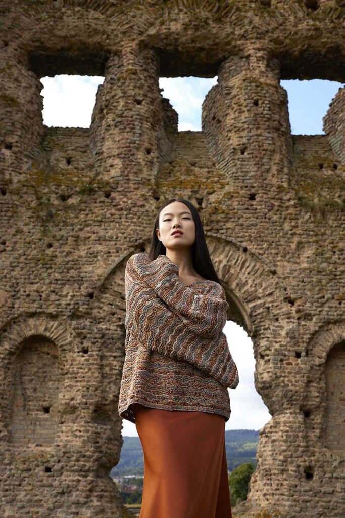 Symbolizing the passage of time, the stitch pattern in the LAYERS OF HISTORY sweater creates an appearance reminiscent of geological layers. This effect is further enhanced by the use of multicolored yarn in the knitting process.