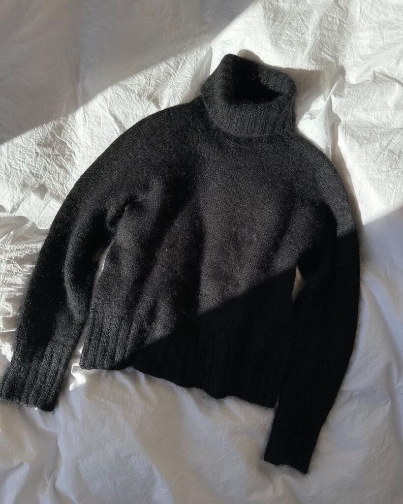 Der Caramel Sweater wird von oben nach unten mit Raglanzunahmen auf der Passe gestrickt. Der Caramel Sweater zeichnet sich durch einen langen Rollkragen im doppelten Rippenmuster aus und der Halsausschnitt wird mit Hilfe von verkürzten Reihen am Übergang vom Rollkragen zur Passe geformt. An den Bündchenabschlüssen von Rumpf und Ärmeln wird ebenfalls ein doppeltes Rippenmuster gestrickt. Auch wenn sich die Bündchen beim Stricken zusammen ziehen, öffnen sie sich durch die Wäsche und beim Tragen. Der Caramel Sweater muss nicht zusammengenäht werden.