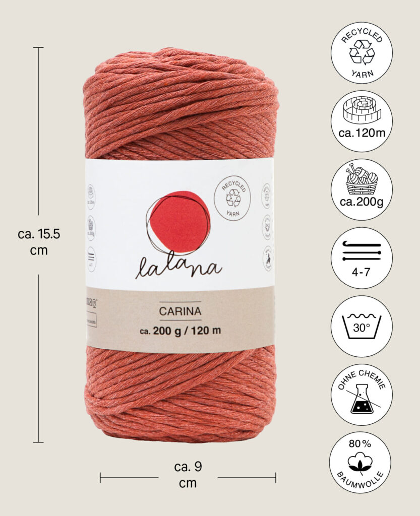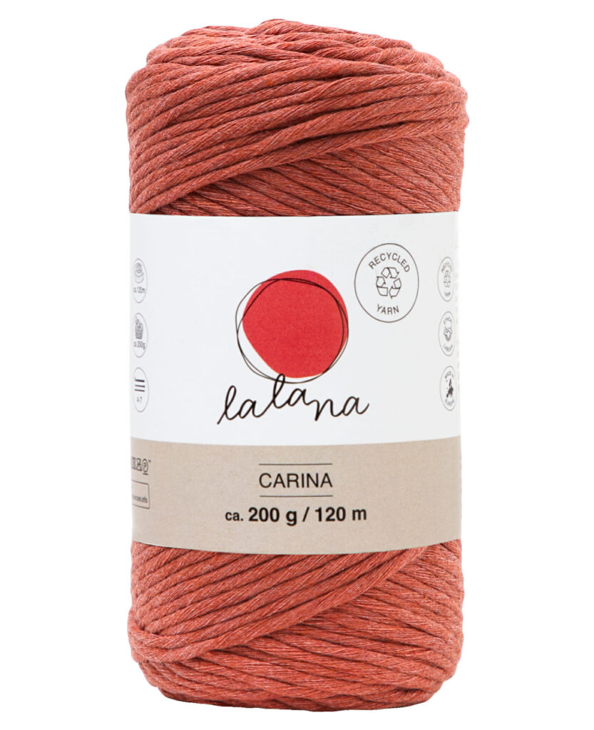 lalana Carina ist ein weiches und flexibles Garn. Das angenehme Carina Garn mit losen Fäden eignet sich für fast all deine Projekte, häkeln, stricken, Makramee ist alles möglich.