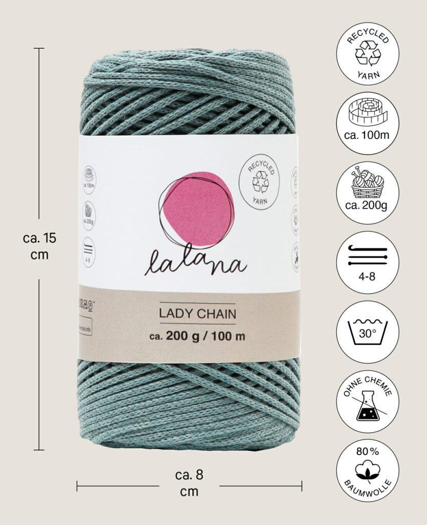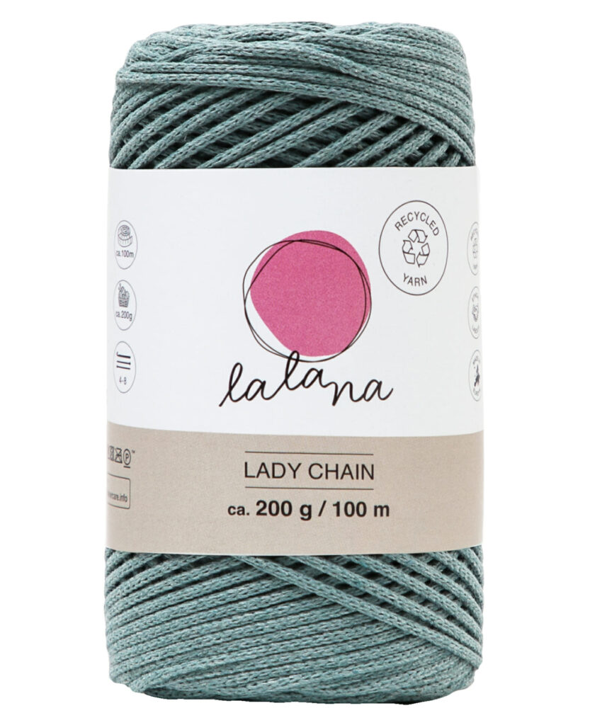 lalana Lady chain ist ein Kettengarn mit dem alles gemacht werden kann. Häkeln, stricken, knüpfen in schönster Farbenpracht. Es ist ein leichtes recycletes Garn aus 80% Baumwolle und 20% Mischfasern