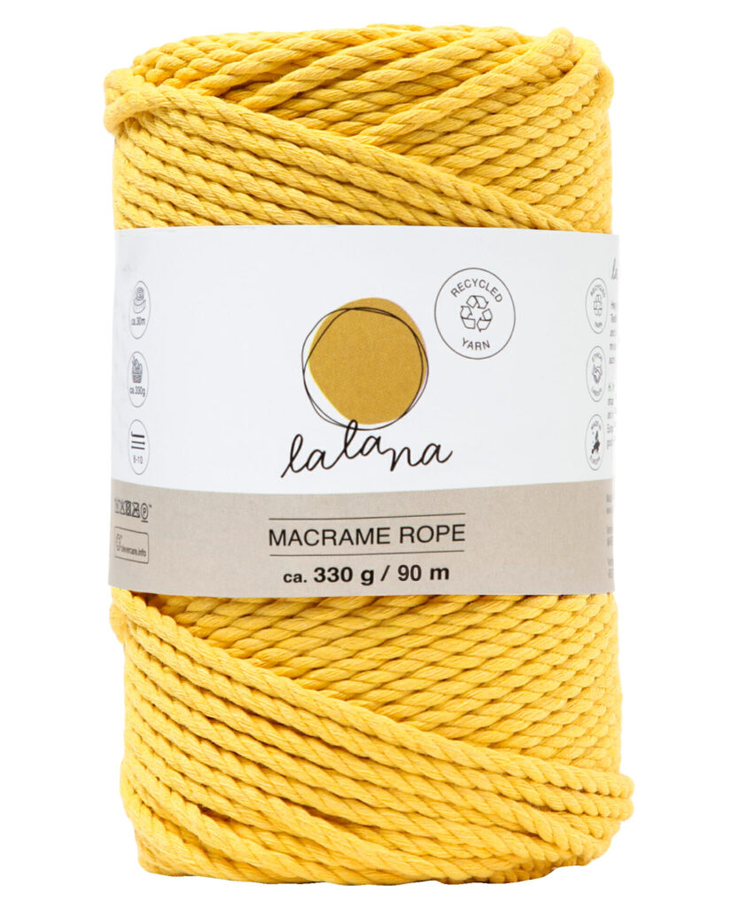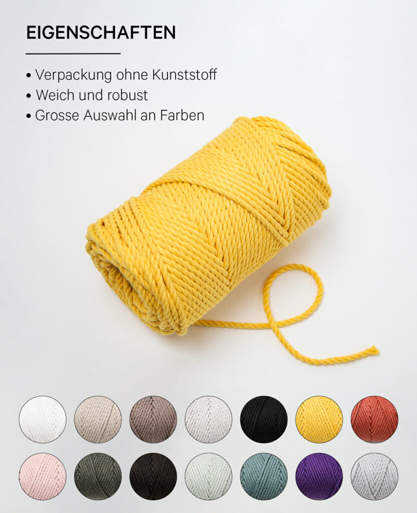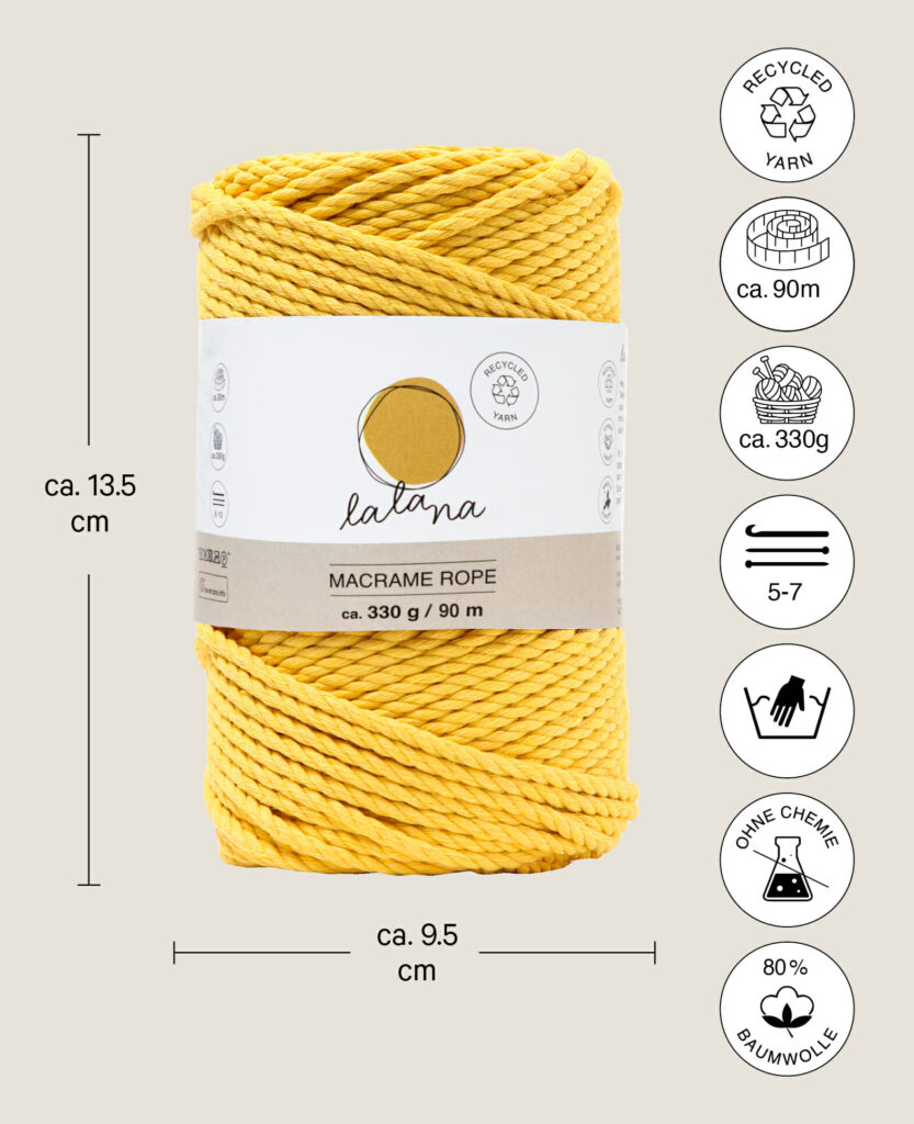 lalana Macrame rope 5 mm ist die typische 3-strängig gedrehte Makramee Kordel. Damit gelingen Makramee Arbeiten wie Wanddekorationen, Blumenampeln, Schlüsselanhänger usw. ganz bestimmt.