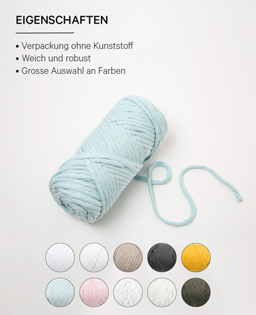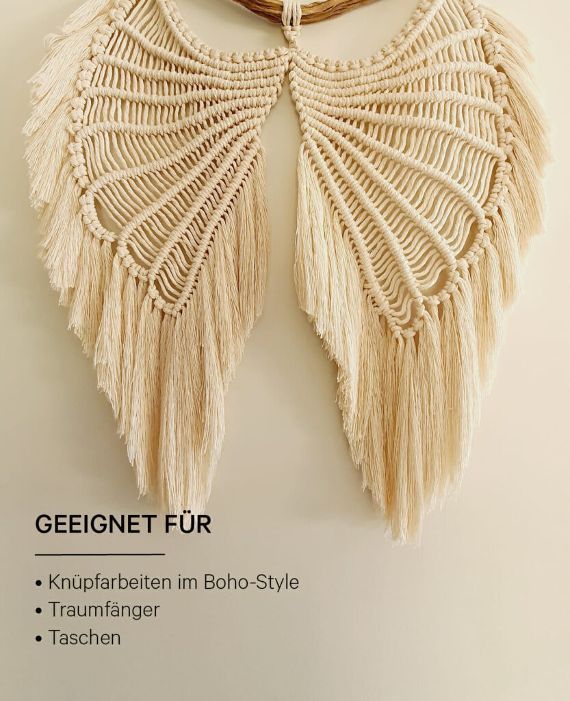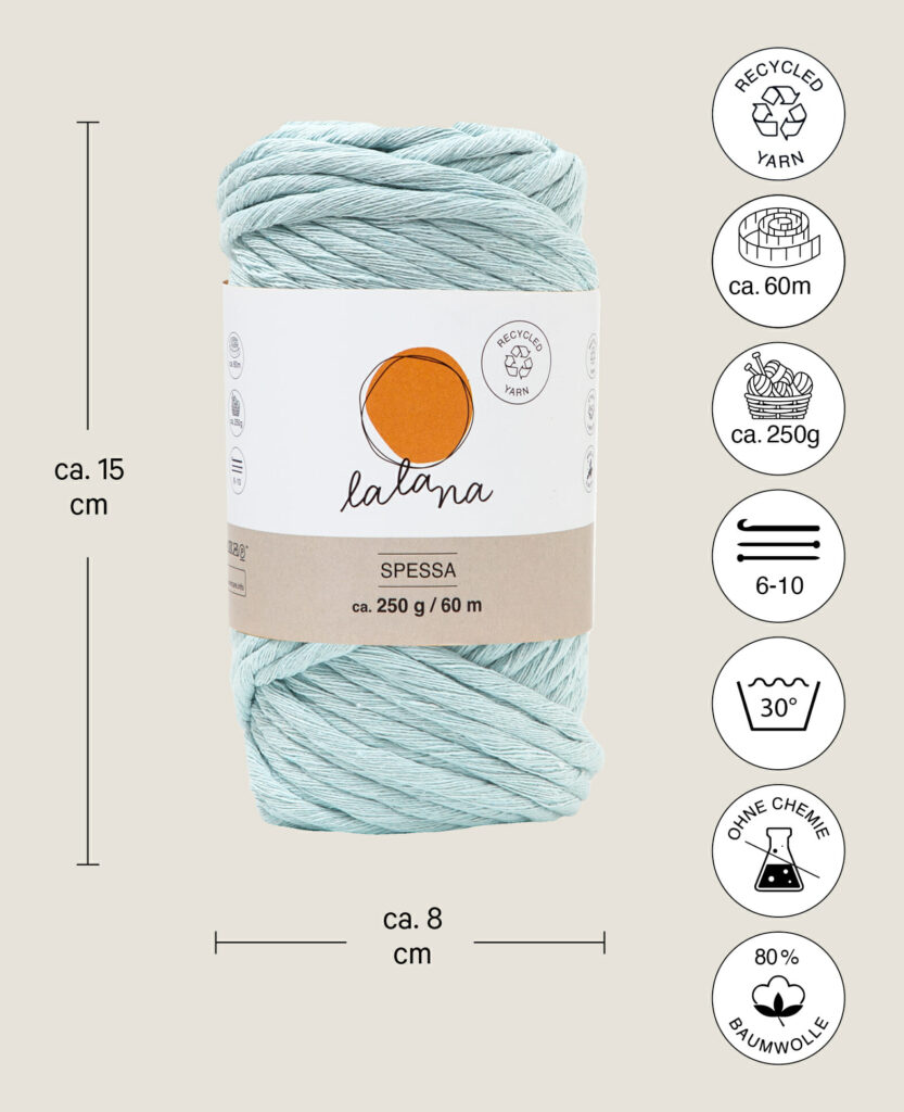 lalana Spessa ist ein dickes Makramee-Baumwollgarn aus 80 % Baumwolle, 20 % Mischfasern. Mit dem Garn kannst du schönste DIY Makramee und XL Häkel- Strick- und Webkreationen anfertigen.
