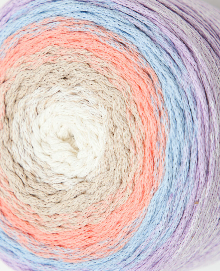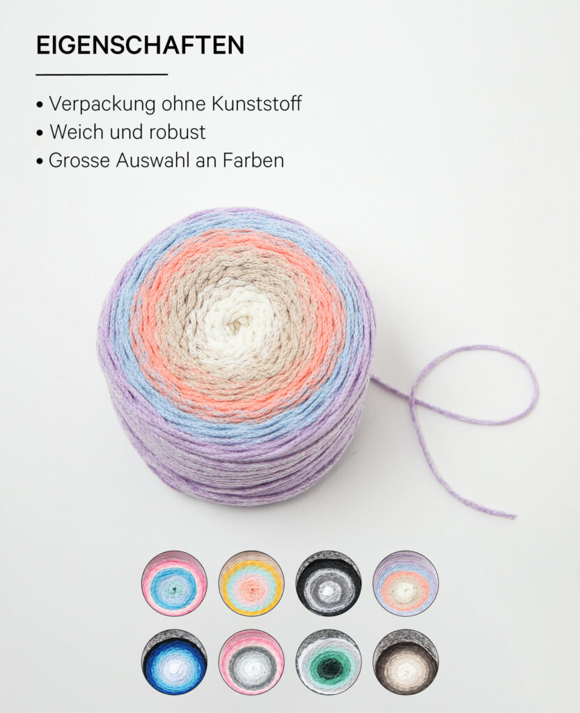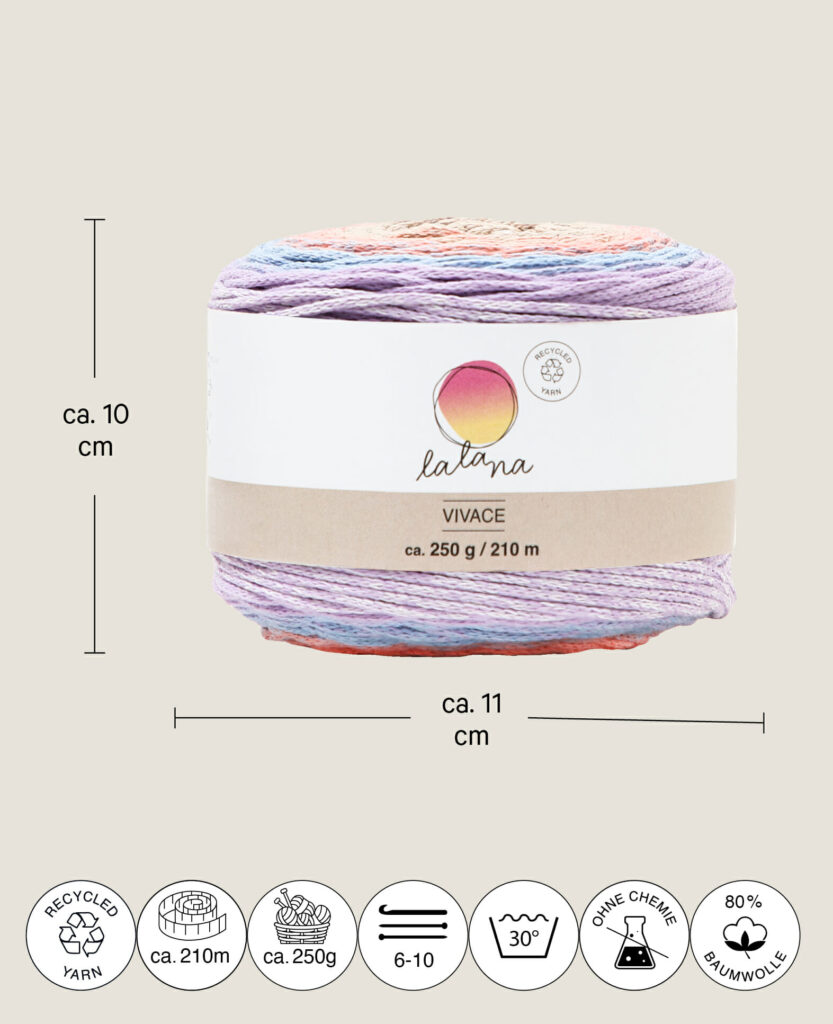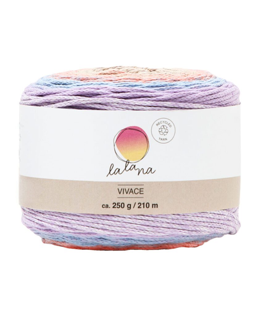 lalana vivace ergibt super schöne Farbverläufe! Das receyclete Garn aus 80 % Baumwolle und 20 % Mischfasern ist softig weich und hervorragend zur Verarbeitung von Häkel- Stricktaschen, Schals, Decken usw.