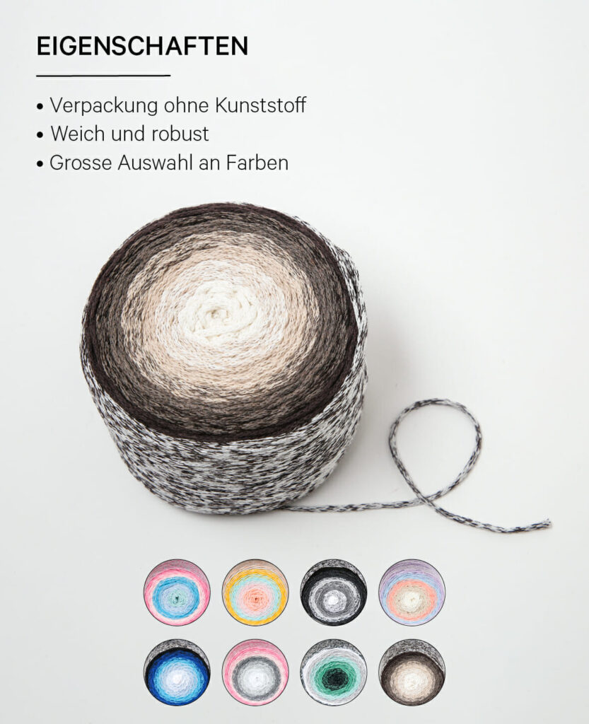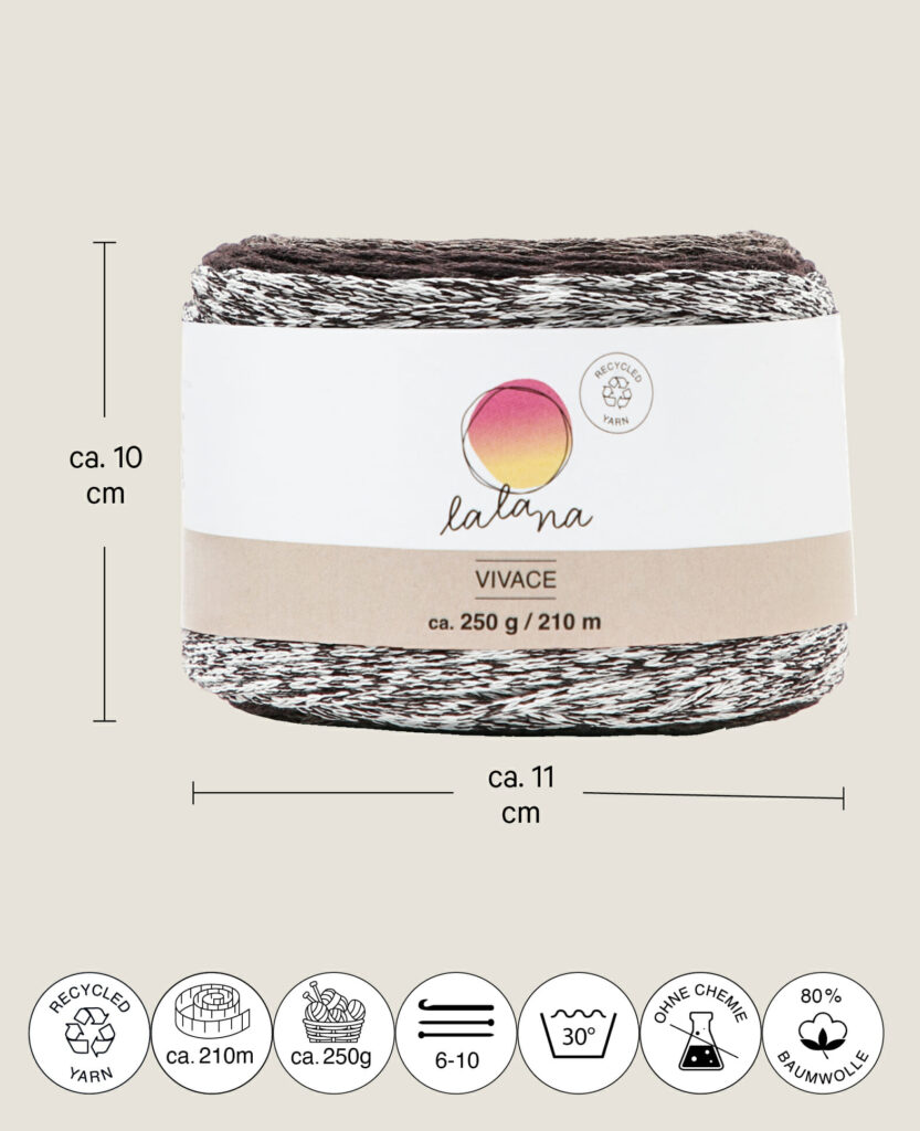 lalana vivace ergibt super schöne Farbverläufe! Das receyclete Garn aus 80 % Baumwolle und 20 % Mischfasern ist softig weich und hervorragend zur Verarbeitung von Häkel- Stricktaschen, Schals, Decken usw.