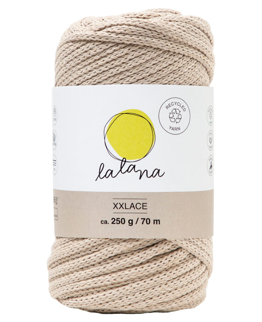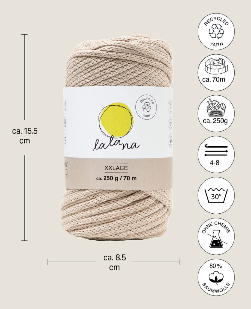 lalana XXlace ist, wie der Name schon sagt, ein dickeres Kettengarn, mit welchem alles gemacht werden kann. Häkeln, stricken, knüpfen in schönster Farbenpracht.