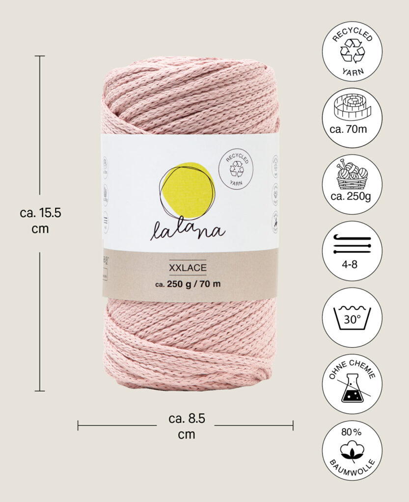 lalana XXlace ist, wie der Name schon sagt, ein dickeres Kettengarn, mit welchem alles gemacht werden kann. Häkeln, stricken, knüpfen in schönster Farbenpracht.