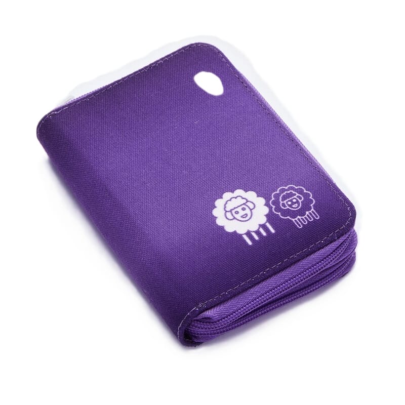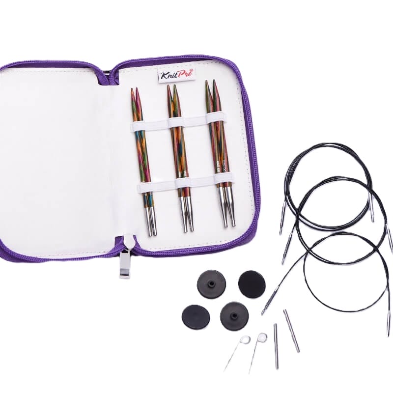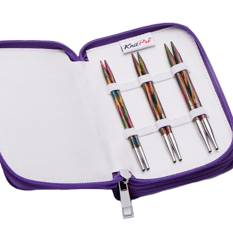 Die 3 Rundstricknadeln in den Stärken 4.00, 5.00 und 6.00 mm, die um 360° drehbaren Edelstahlseile in den Längen 60, 80 und 100 cm sowie das Zubehör sind in einem violetten Stoffetui verpackt. Das Reissverschlussetui eignet sich perfekt zum Aufbewahren und zum Stricken unterwegs.