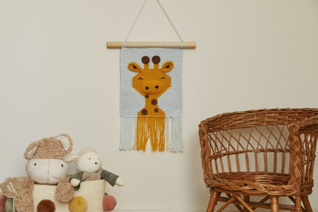 Dieser freundliche Giraffen-Wandbehang wäre ein herzliches handgemachtes Geschenk für ein Baby, ein Kind oder eine werdende Mutter.